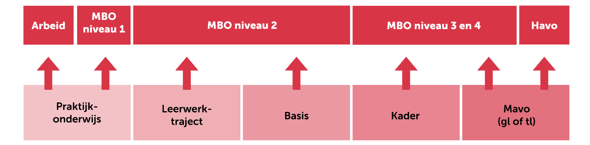 In het schema hieronder zie je per leerweg naar welke vervolgopleiding je kunt doorstromen.